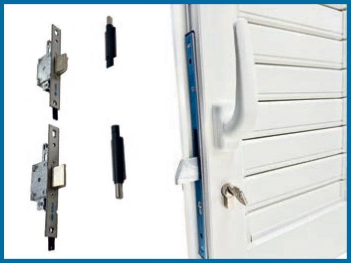 serratura a montante con coppia di deviatori laterali superiori e inferiori; catenaccio a leva metallica;