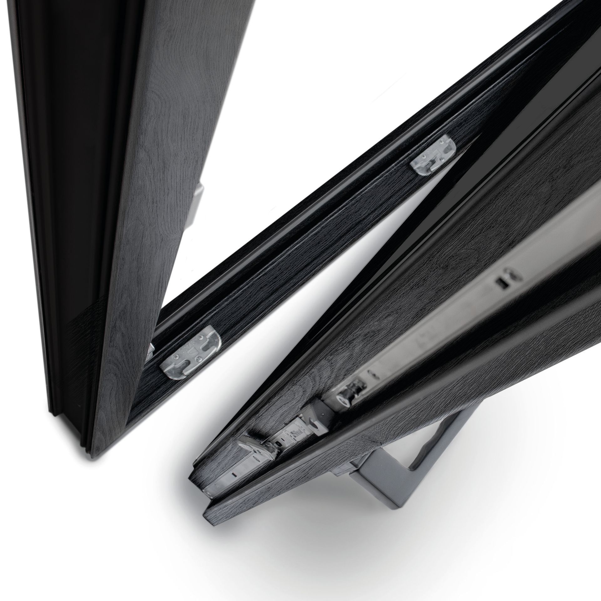 Esternamente, il profilo dell’anta è totalmente coperto dal vetro con smaltatura perimetrale di colore nero, per un effetto tutto vetro;